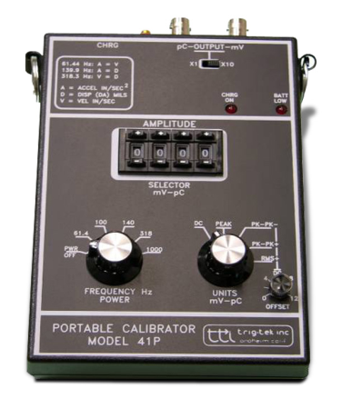 - 41P便攜式校準儀是一款手持式的信號發生器,可以產生精確的頻率及幅值信號,信號形式為電壓以及電荷量,頻率穩定度為0.1%,可產生直流或者交流信號,範圍從0.1到9999mV及對應的電荷量。可由內部電池供電方便在現場使用。